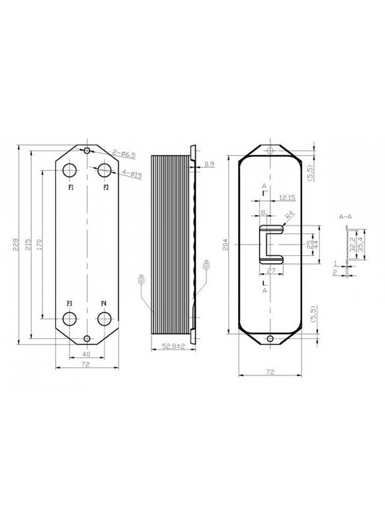 Из-за необычной формы верхней пластины теплообменник имеет необычную длину – 228 мм от края до края. Расстояния между центрами отверстий составляет 170 мм, а между центрами креплений – 215 мм. Состоит из 14 пластин без учета ромбовидной верхней